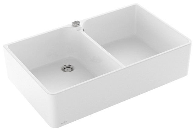 V&B Spülstein Doppelbecken 90 X Ablaufgarnitur mit Handbetätigung, mit Excenterbetätigung, weiß alpin CeramicPlus
