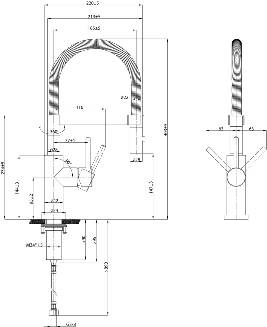 Material Kartusche aus Kunststoff, Keramikdichtscheiben, Anschlussgewinde G3/8, Schwenkbereich 360 Grad, Öffnungswinkel des Hebels 25 Grad, Installationsabstand zur Wand beachten, da die Kalt- und Warmwasserregulierung jeweils um 45 Grad in Richtung Küchenspüle und in Richtung Wand erfolgt, Durchflussmenge Laminarstrahl 7,28 l/Min, Durchflussmenge Brausestrahl 7,03 l/Min, flexible Anschlussschläuche, Länge 800 mm, flexible Handbrause, Handbrause mit zwei Strahlfunktionen, Sockelhöhe bei ausgezogener Armatur 54 mm, Freiraum in oder neben der Küchenspüle zum Nutzen der Window-Funktion notwendig, Armatur lässt sich flexibel herausziehen und auf Arbeitsplatte ablegen und ermöglicht somit Vorfensterinstallation