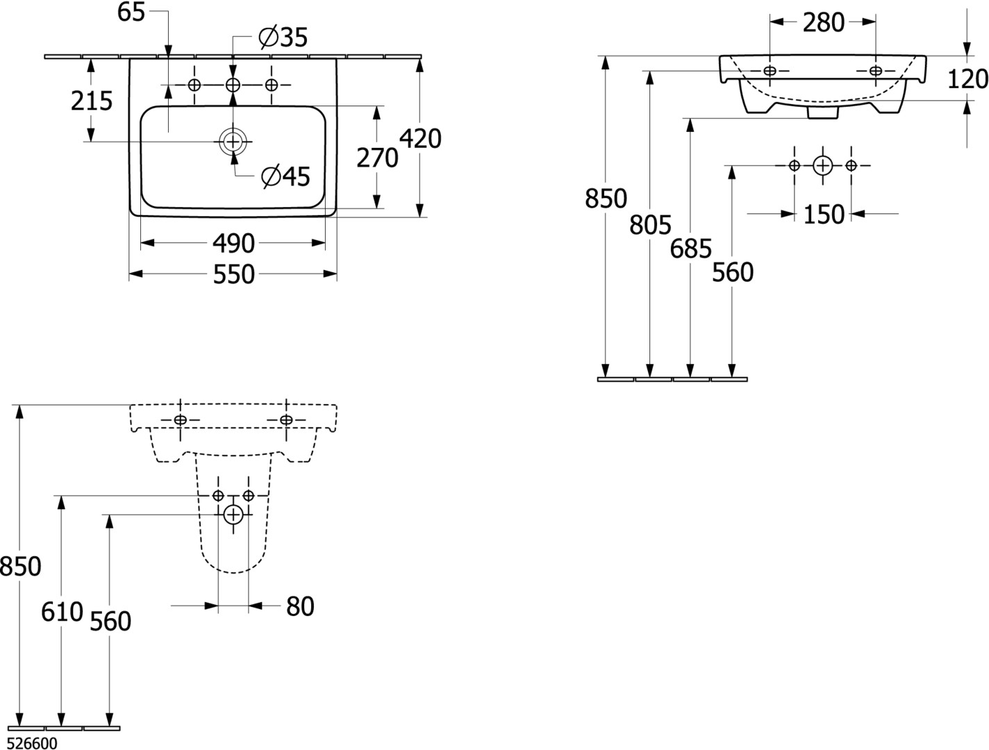 V&B Waschtisch Architectura 55x42cm, 1 Hahnloch, ohne Überlauf, weiß W37718