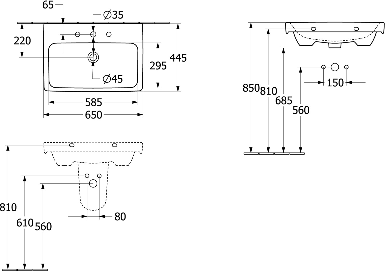 V&B Waschtisch Architectura 65x44,5cm, 1 Hahnloch, ohne Überlauf, weiß W37742