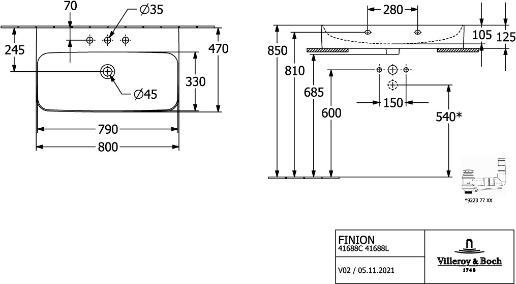 V&B Waschtisch Finion 80x47cm, mittleres Hahnloch durchstochen, ohne Überlauf, Unterseite geschliffen, pure black C+ W921507