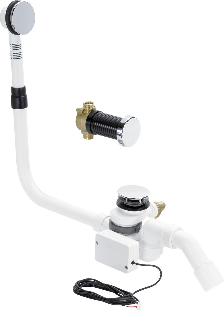 für Wanne mit Mittelablauf, Ablaufloch Ø 52 mm, für Wasserzulauf durch Ablaufkörper, geeignet für Multiplex Trio E- Armatur Mischeinheit elektronisch Modell 6146, Multiplex Trio E2- Armatur Mischeinheit elektronisch Modell 6146.2, Multiplex Trio E3- Armatur Mischeinheit elektronisch Modell 6146.215, Ventilkegel motorbetrieben, bestehend aus Überlaufrosette verchromt, Abdeckhaube verchromt, Einlaufelement, Geruchsverschluss, Ablaufbogen 45°, UP-Rohrunterbrecher DN 20, DIN EN 1717 Sicherungseinrichtung DB mit Rosette RU2, Ventilkegelbetätigung elektrisch, DC-Motor 12 V/0,5 A, on-off pulse count, Pulsdauer max. 3 Sek., Anschlussleitung 3 m JST/XHP 5, Sperrwasserhöhe 50 mm, Ablaufleistung Anstauhöhe 300 mm 0,85 l/s, Überlaufleistung Anstauhöhe 60 mm über Mitte Überlaufloch 0,63 l/s, güteüberwacht nach DIN EN 274