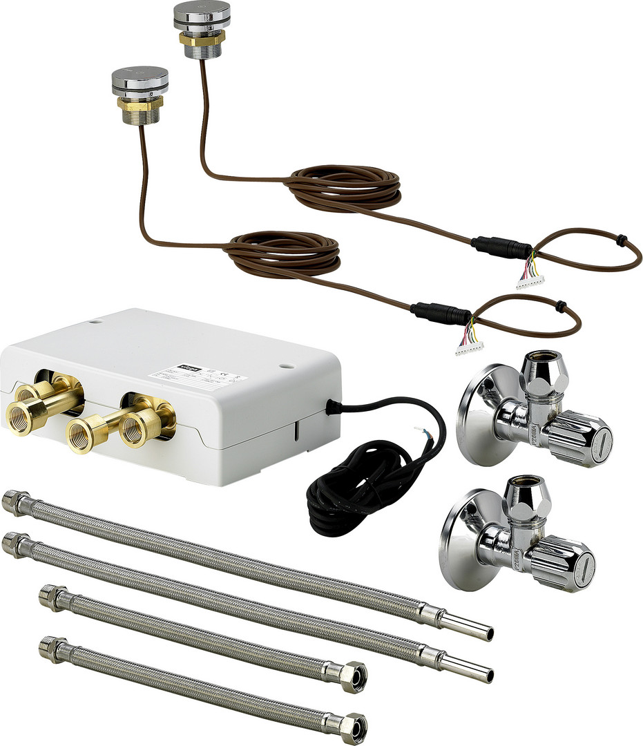 Mischeinheit für Befüllung einer Badewanne (elektronisch gesteuert), in Verbindung mit Multiplex Trio, Multiplex Trio F, Rotaplex Trio oder Rotaplex Trio F (optional elektrisch betrieben), elektrisches Öffnen/Schließen einer Viega Ablaufgarnitur, fernbedienbar durch mobile Endgeräte (Android, iOS, Windows) im Direktbetrieb oder Internet mit Multiplex Trio E-WLAN-Modul, 2 Bedienelemente verchromt, Speicherfunktion für Temperatur und Wasserzulaufmenge sowie Füllhöhe, 3 personalisierbare Voreinstellungen, Wanneneinlauf- Handbrausenfunktion manuell umschaltbar, 38 °C-Sperre manuell überbrückbar, Anschlussschläuche flexibel, Eckventile, Netzteil, Netzspannung 100-240 V AC/50-60 Hz, nach DIN EN 1111