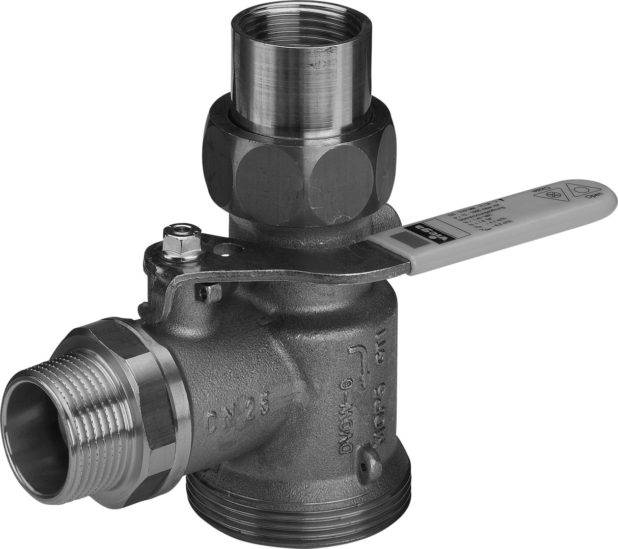 für Einstutzengaszähler, Eingang R-Gewinde, Ausgang Verschraubung mit Rp-Gewinde, abschließbar, plombierbar, Eckform, mit Prüföffnung < 1 mm, Prüfschraube G 1/8, Umgebungstemperatur max. 70 °C, Betriebsdruck max. 0,5 MPa (MOP 5), höher thermisch belastbar, 650 °C/30 min GT1, mit DIN-DVGW-Prüfzeichen
