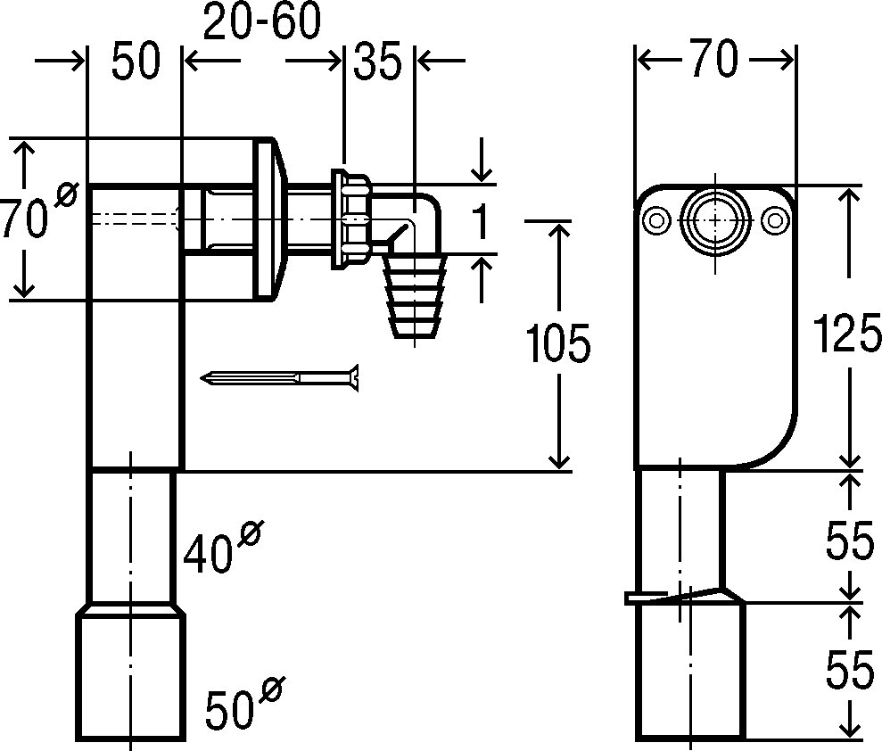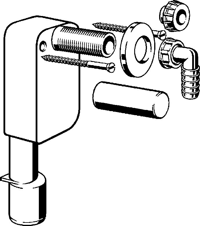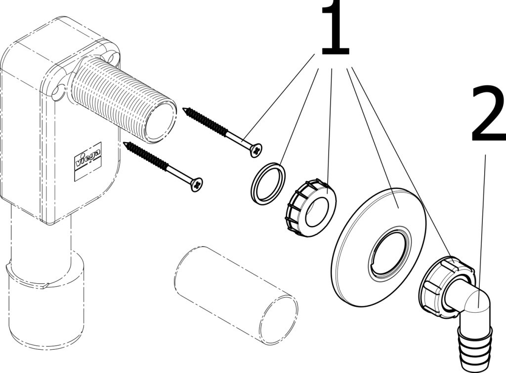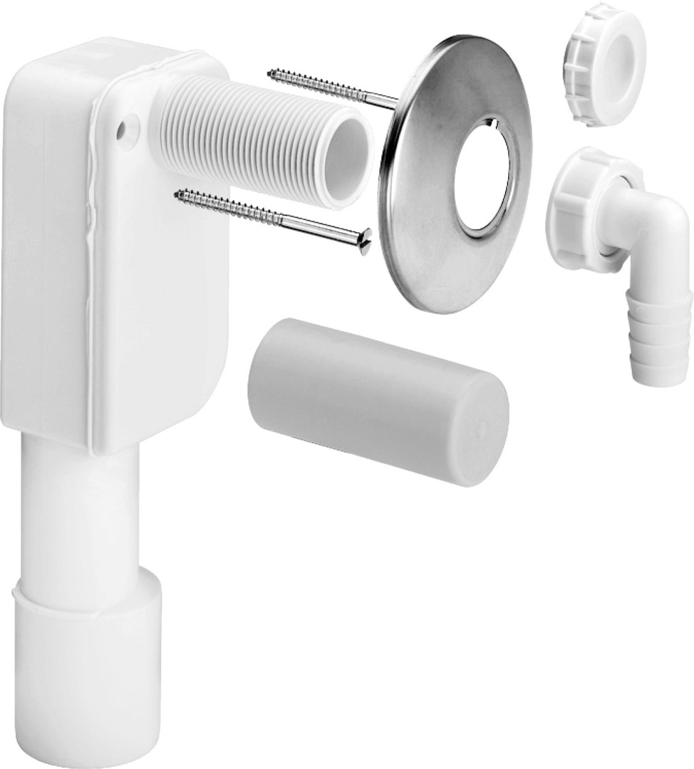 für Wandeinbau, Abwasserschlauch von Wasch- oder Geschirrspülmaschine, Befestigungsschrauben, Schutzkappe für Gewinde, Schlauchverschraubung 90°, Verschlusskappe, Rosette Edelstahl, güteüberwacht nach DIN 19541