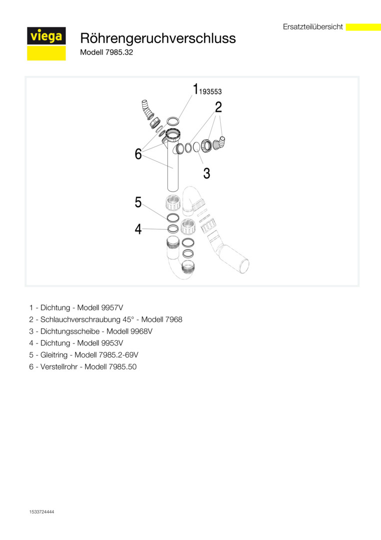Viega Röhrengeruchsverschluss 7985.32 G 1 1/2 x DN 50, Kunststoff weiß, mit 45° Ablaufbogen