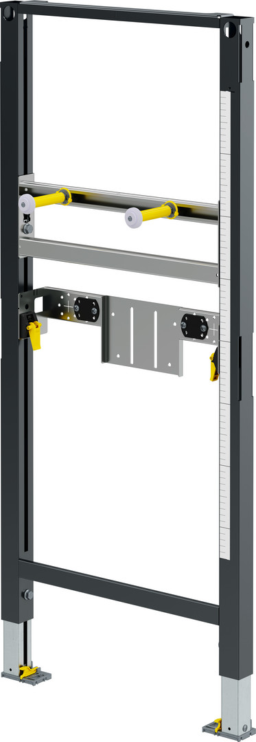 Rahmen pulverbeschichtet (40 x 40), Keramikbefestigung höhenverstellbar, Anschlüsse mit Schnellspanner höhenverstellbar (Träger mit Maßband zur Ausrichtung), Universal-UP-Geruchverschlusshalter, Befestigungsmaterial, Fußbremse zum Einstellen der Bauhöhe