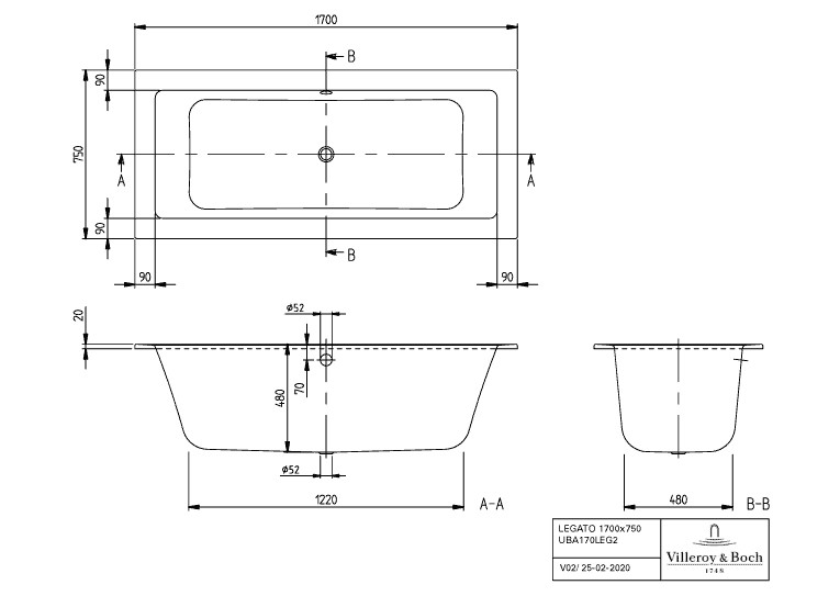 Villeroy & Boch rechteckige Badewanne Legato UAC170LEG2A1V, 1700 x 750 x 660 mm, Rechteck, mit Whirlpoolsystem Airpool Comfort (AC), Technik Position 1, Weiß Alpin