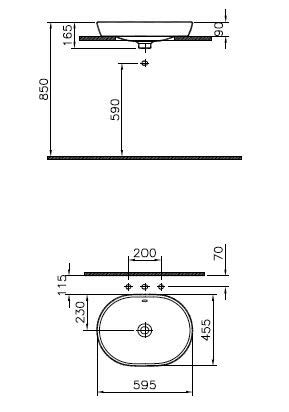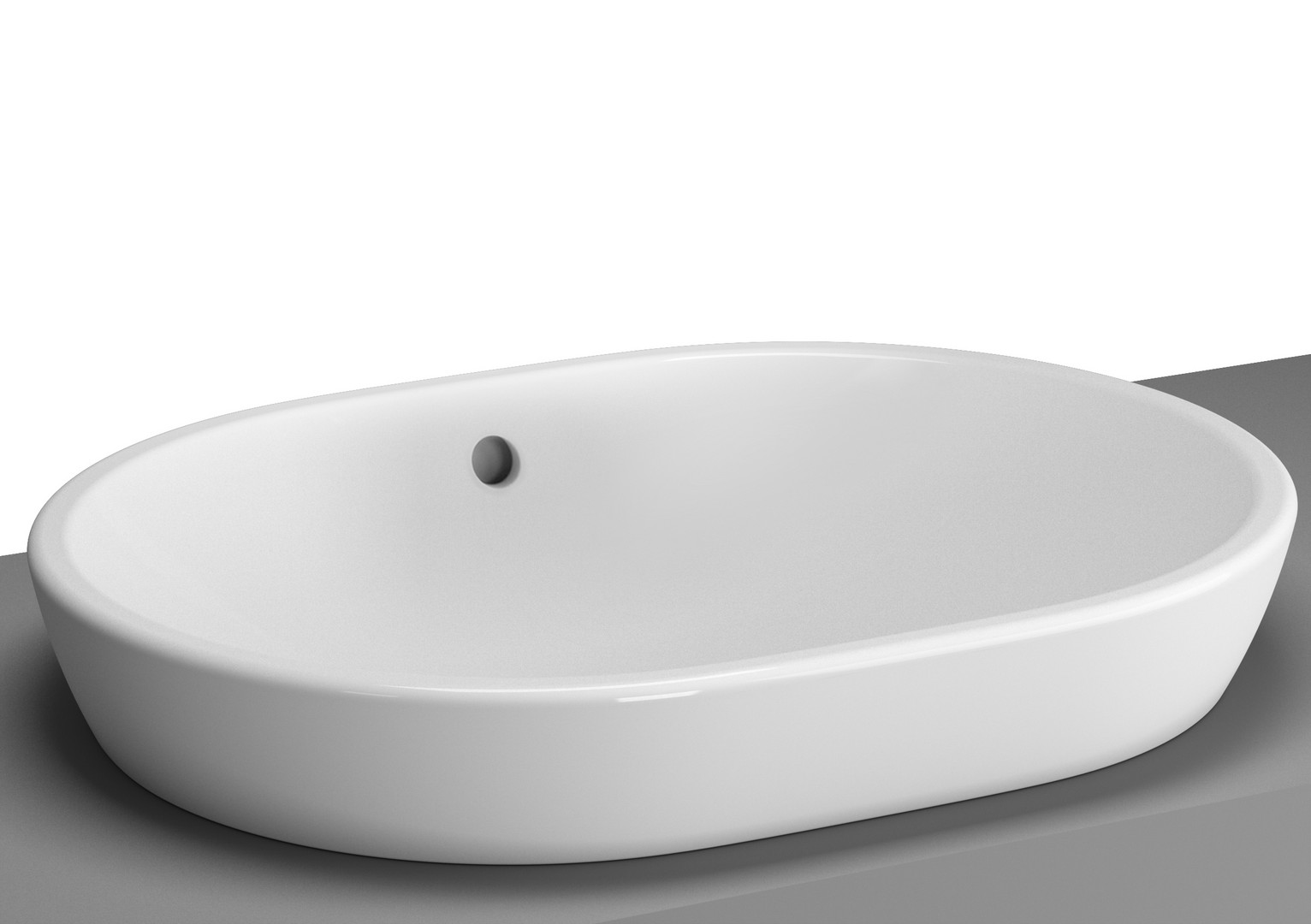 oval, 595 x 455 mm, freistehend, Unterseite geschliffen, ohne Hahnlochbank, ohne Hahnloch, mit Überlaufloch