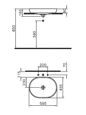 oval, 595 x 455 mm, freistehend, Unterseite geschliffen, ohne Hahnlochbank, ohne Hahnloch, mit Überlaufloch
