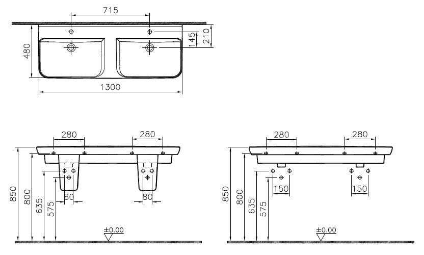 VitrA Bad Doppelwaschtisch Sento 130x48cm, unterbaufähig, je Becken 1 Überlauf, je Becken 1 Hahnloch, weiß VC W58516