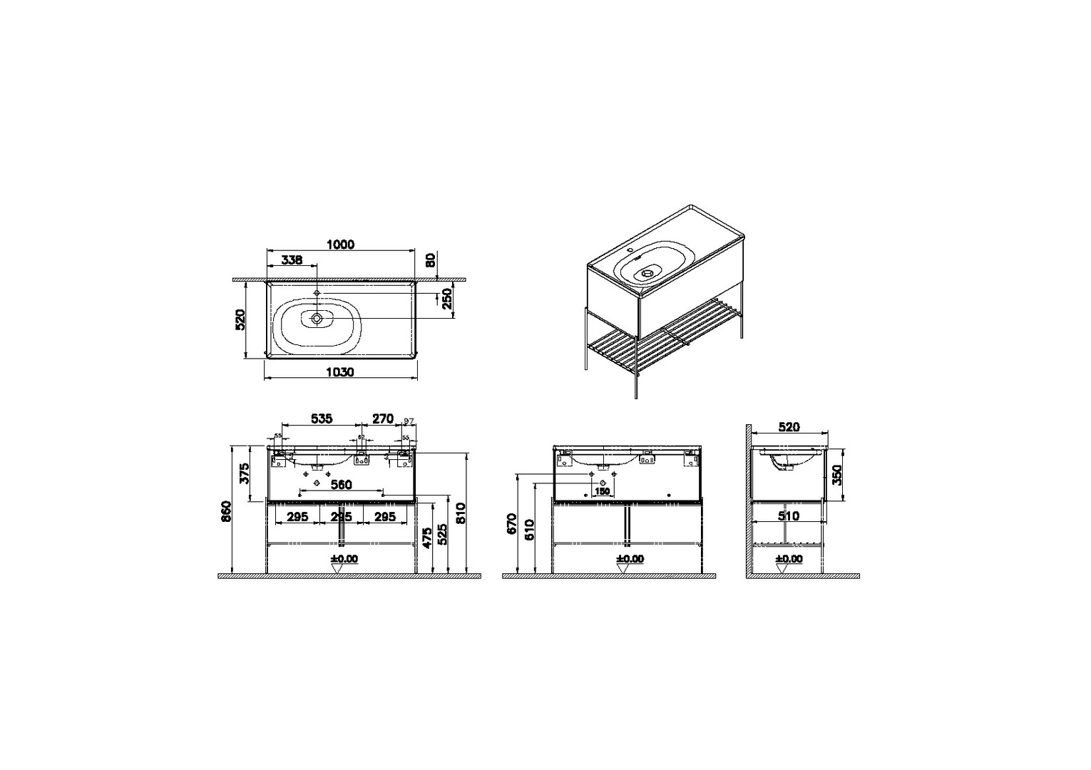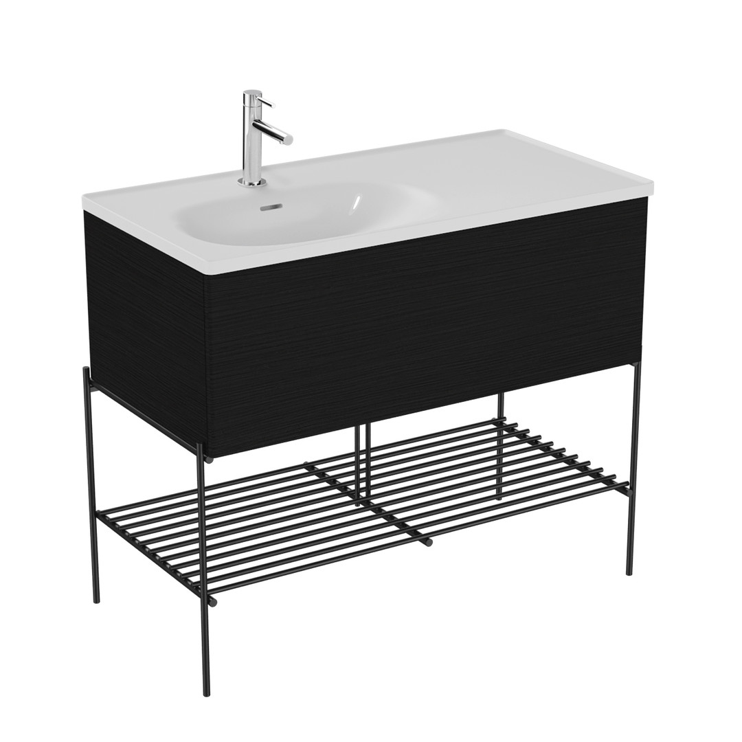 Höhe 86 cm, bodenstehend, wandgebunden, Korpus MDF und Thermofolie, Fussgestell mit Ablagegitter Metall schwarz matt pulverbeschichtet, 1 Vollauszug (Softclose), mit Möbelwaschtisch weiß hochglanz, mit VitrA Clean, 1 Hahnloch mittig, mit Überlaufschlitz