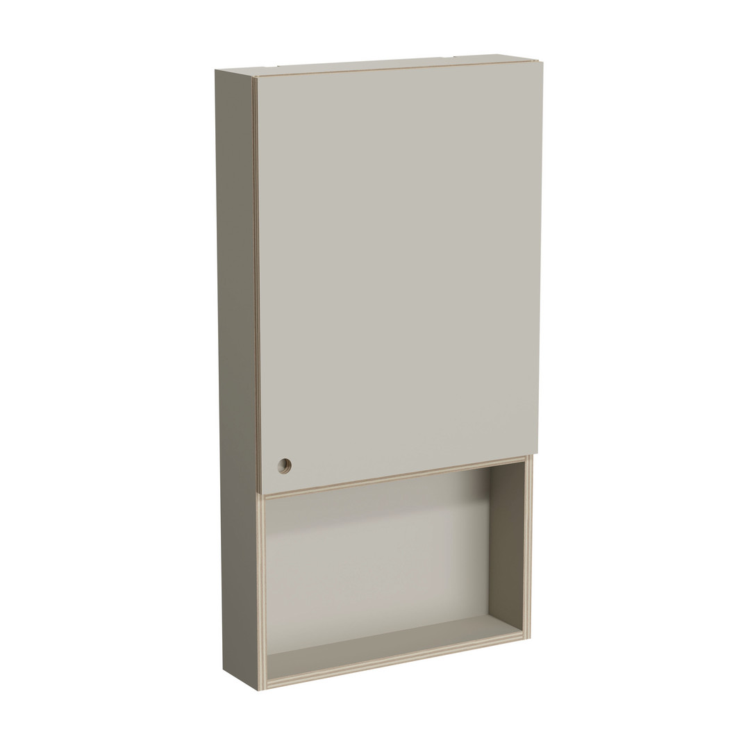 Material aus Multiplex + Laminat, Griffloch rund, wandhängend, 1 Tür (Softclose), 1 Regalboden, 1 offene Ablage (unterhalb der Tür)