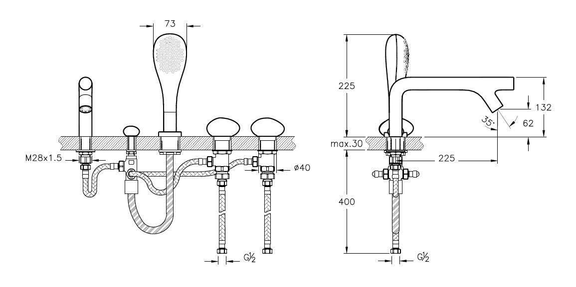 VitrA Bad Wannenfüll-/Brause-Zweigriffarmatur Istanbul Ausladung Auslauf 225mm, mit Brausegarnitur, Wannenrandmontage, chrom