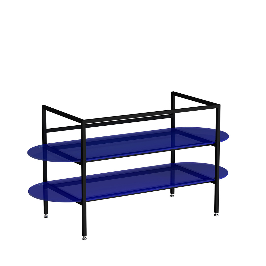 Material Korpus Aluminiumrahmen schwarz matt lackiert, Ablage gehärtetes und laminiertes Glas, bodenstehend, 2 Glasablagen, 4 Möbelfüße verstellbar, Edelstahl