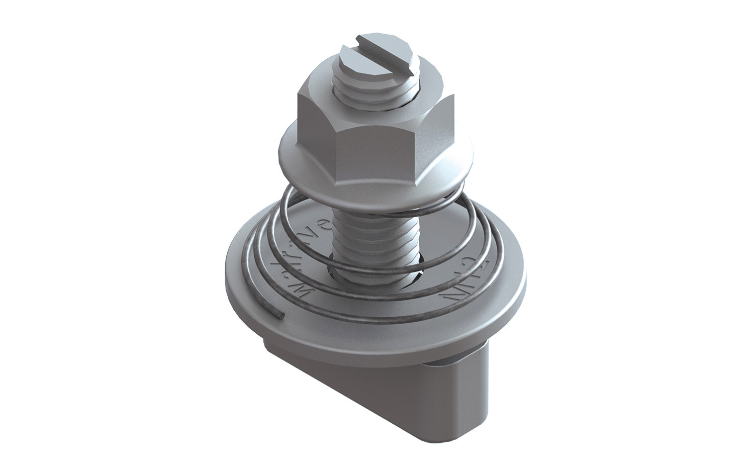 formschlüssiger Hammerkopf zur Befestigung von Verbindern an Maxx-Profilen, hält die Konstruktion vor dem endgültigen Festziehen in Position, Hammerkopf eindrücken, 90° drehen und mit Schraubenschlüssel fixieren, sichtbare Markierung auf der Oberseite um die Position des Hammerkopfes zu erkennen, mit Vierkantschaft zum Festsetzen im Profillochbild beim Anziehen, Material Stahl, Festigkeitsklasse 8.8, Feder aus Edelstahl (AISI 316), feuerverzinkt