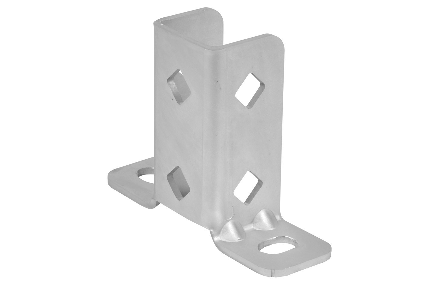 flexibel einsetzbare Grundplatte für Strut-Montageschienen, offene Seite frei ausrichtbar, erhöhte Befestigkeit durch verstärkte Flansche, auf Strutschienen abgestimmtes Lochbild, Oberflächenbeschichtung Ultra Protect 1000 Systemtechnologie, ein System für Installationen im Innen- und Außenbereich, besteht min. 1000 Std. Salzsprühtest nach DIN ISO 9227