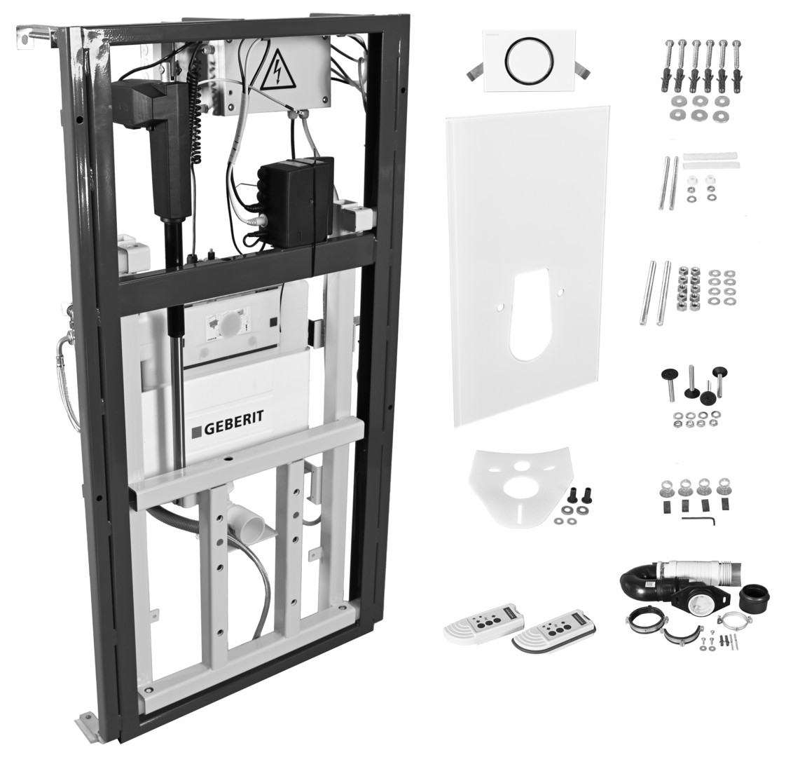 mit vormontiertem Geberit Spülkasten, die Sitzhöhe ist permanent stufenlos bis zu 30 cm elektrisch verstellbar, Setz-/Aufstehhilfe, mit Funkfernbedienung für elektrische Höhenverstellung, erweiterbar um Vorsatzrahmen und Edelstahlarmlehnen
