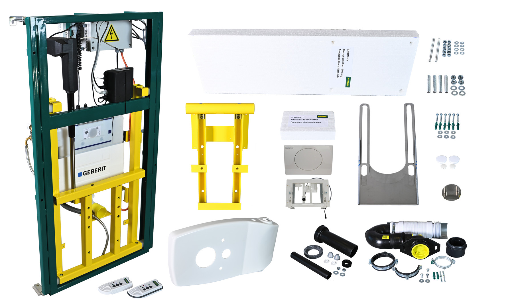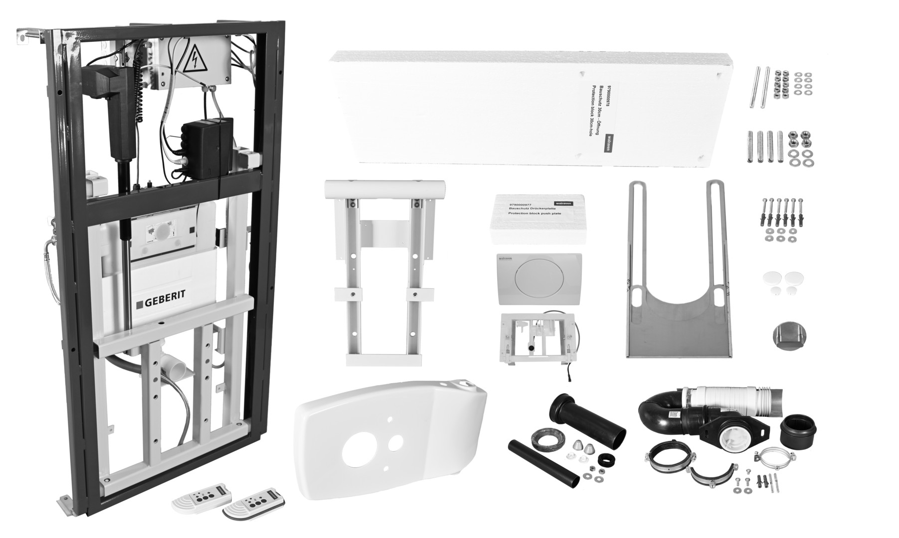 mit vormontiertem Geberit Spülkasten, geeignet zum Einsatz in Kliniken, Reha-Zentren, Seniorenheimen und im Mehr-Generationenhaushalt, Ausführung wie Vario WC DeLuxe 30, jedoch mit einem zusätzlichen Strom sowie Wasseranschluss zur Aufnahme der meisten Dusch-WCs (Detailprüfung erforderlich), getestet und entwickelt nach DIN 18030 und 33455, mit Betätigungsplatte Ellipse, mit Fernsteuerung für elektrische Höhenverstellung (0353068)