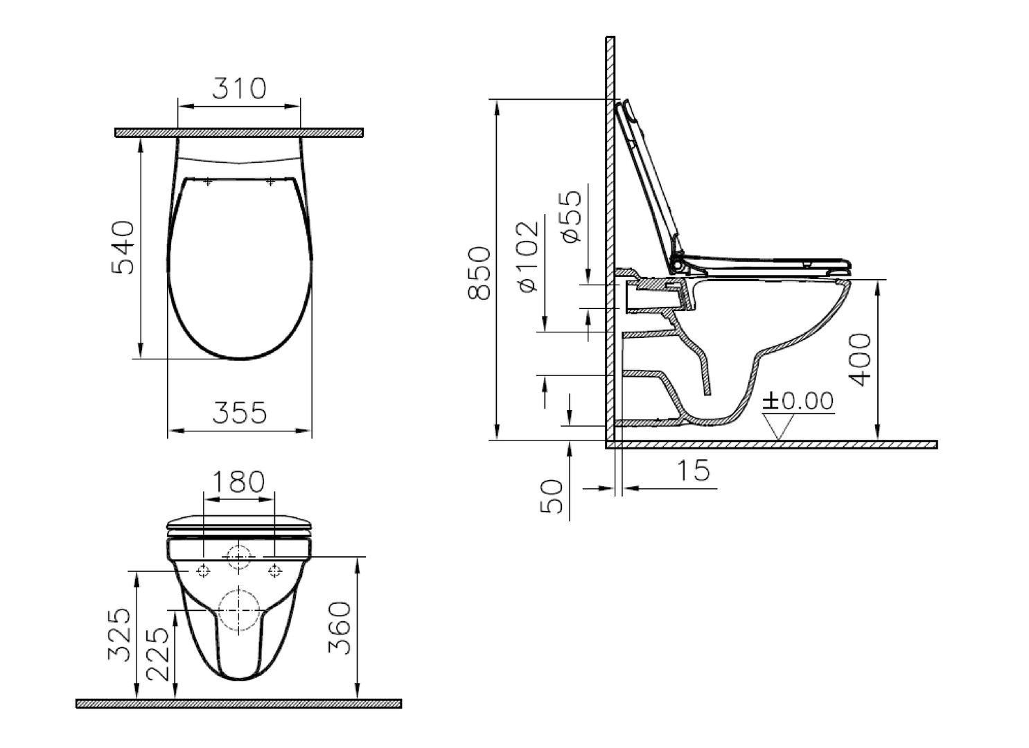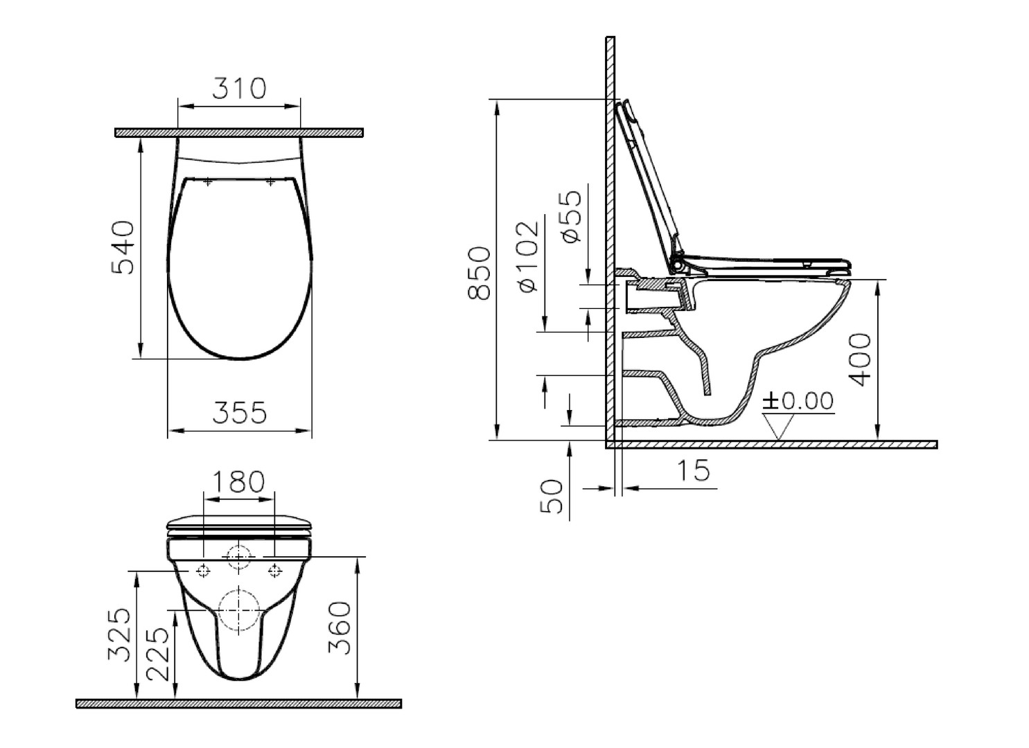 Wand-Tiefspül-WC-Paket Vitra norm 54x35,5cm, spülrandlos, mit WC-Sitz, weiß