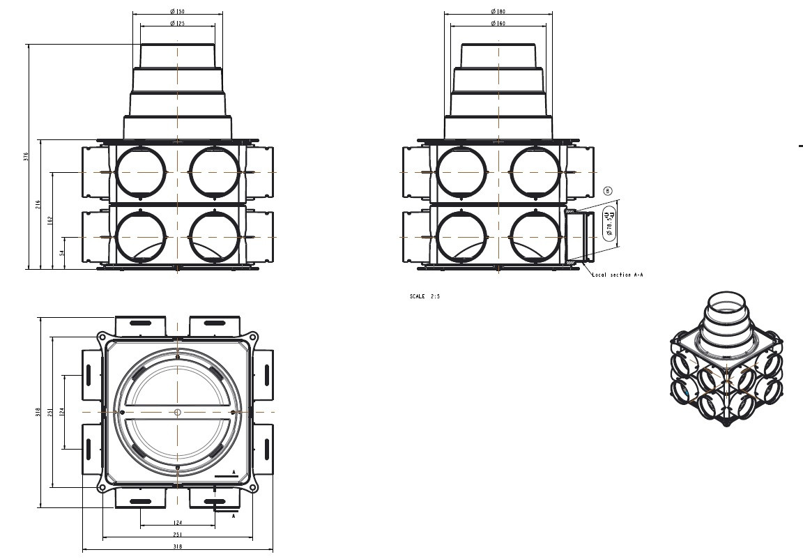 Wolf Luftverteiler Mini 16-75, für CWL, Anschluss ISO Rohr DN125-180, flach