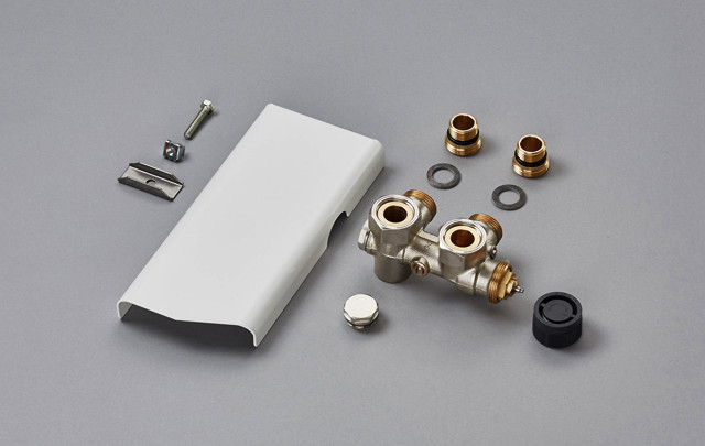 für Ein- und Zweirohrsysteme (Anschlussmaß 50 mm), Ventil rechts, voreinstellbarer Ventileinsatz AV9, beidseitig anströmbar, für Thermostat M 30 x 1,5 mm, Anschlüsse nach hinten 3/4" AG, Vorlauf/Rücklauf absperrbar, mit Anschluss 1/2" für Heizstab links (Einbau nachträglich bei Abnahme der Armatur möglich), Anschluss-Armatur eingestellt auf Zweirohrbetrieb, durch Öffnen der Bypass- Schraube für Einrohrbetrieb einsetzbar, Lieferung standardmäßig mit Blende und Abdeckteile-Set für den Heizstab im Farbton des Heizkörpers (bei RAL 9016 ohne Abdeckteile-Set), Befestigungsmaterial für die Blende ist der Armatur beigepackt, Thermostat gegen Aufpreis, Betriebsüberdruck max. 10 bar, 110 °C, Ausführung Anschluss-Armatur für Mixbetrieb mit WIVAR II/WIVAR Hotel