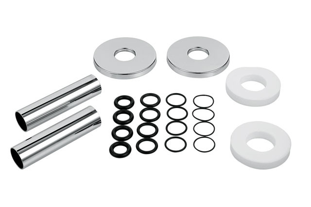 bei Ausführung des Heizkörperanschlusses, für ansprechenden Übergang von der Armatur zur Wand, zur Montage im Zuge der Ausführung des Heizkörperanschlusses, bestehend aus: 2x Rohrhülsen Ø 18 mm (außen), O-Ringe für Heizungsrohr Ø 10/12/14/15 mm, 2x Rosette Ø 38 mm, 2x Kunststoffring zum aufkleben und fixieren der Rosette