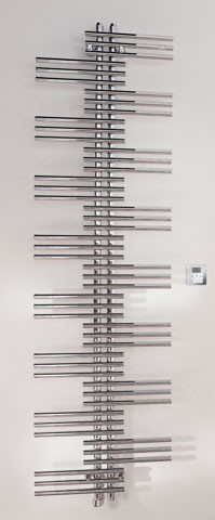 einlagig, lackiert, rein elektrisch, aus horizontal angeordneten Präzisions-Stahlrohren und vertikalen Sammelrohren, Rohrpakete aus jeweils 3 Horizontalrohren symmetrisch im Wechsel links und rechts von den mittig angeordneten Sammlern abzweigend, gefüllt mit Wärmeträgerflüssigkeit, für Netzanschluss 230 Volt, mit Anschlusskabel 1,2 m lang, Konturenstecker, Heizkörper mit Pulverlackierung, Lieferung montagefertig mit Wandkonsolen im Farbton des Heizkörper, Heizstab RACY- C mit separatem, batteriebetriebenem Funksteuergerät Modell 2 zur Bedienung des Heizkörpers, Abdeckung des Heizstabes in Farbton des Heizkörpers, eingebaut im linken Sammelrohr, Anschlusskabel mit Konturenstecker in weiß, Schutzart IP 44