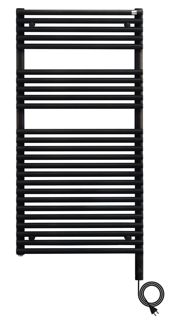 als Handtuchwärmer, rein elektrisch, aus horizontal angeordneten Präzisions-Stahlrohren auf senkrecht verlaufende Rundrohre geschweißt, unsichtbare Schweißnähte durch Kreuzloch-Schweißverfahren, horizontale Stahlrohre Ø 25 mm, vertikale Sammelrohre Ø 38 mm, gefüllt mit Wärmetragerflüssigkeit, für Netzspannung 230 V +/-10%, mit Anschlusskabel 1,2 m lang und Stecker, Trockenlaufschutz gegen Betrieb ohne ausreichender Wärmeträgerflüssigkeit, Lieferung montagefertig mit Wandkonsolen, Standard-Ausführung mit Pulverlackierung im Farbton RAL 9016, auf Wunsch in Sonderfarbe, Elektrobetrieb mit Heizstab IHC: mit integrierter Steuerung und modularem Bedienkonzept, Basisfunktionen direkt am Heizstab einstellbar, für noch einfachere und bequemere Bedienung kann das als Zubehör bestellbare Steuergerät Easy oder die App Zehnder Connect genutzt werden, Steuereinheit je nach Heizkörperfarbe in weiß, grau oder schwarz, eingebaut im rechten Sammelrohr, Anschlusskabel mit Konturenstecker in Farbe der Steuereinheit, Schutzart IP 54