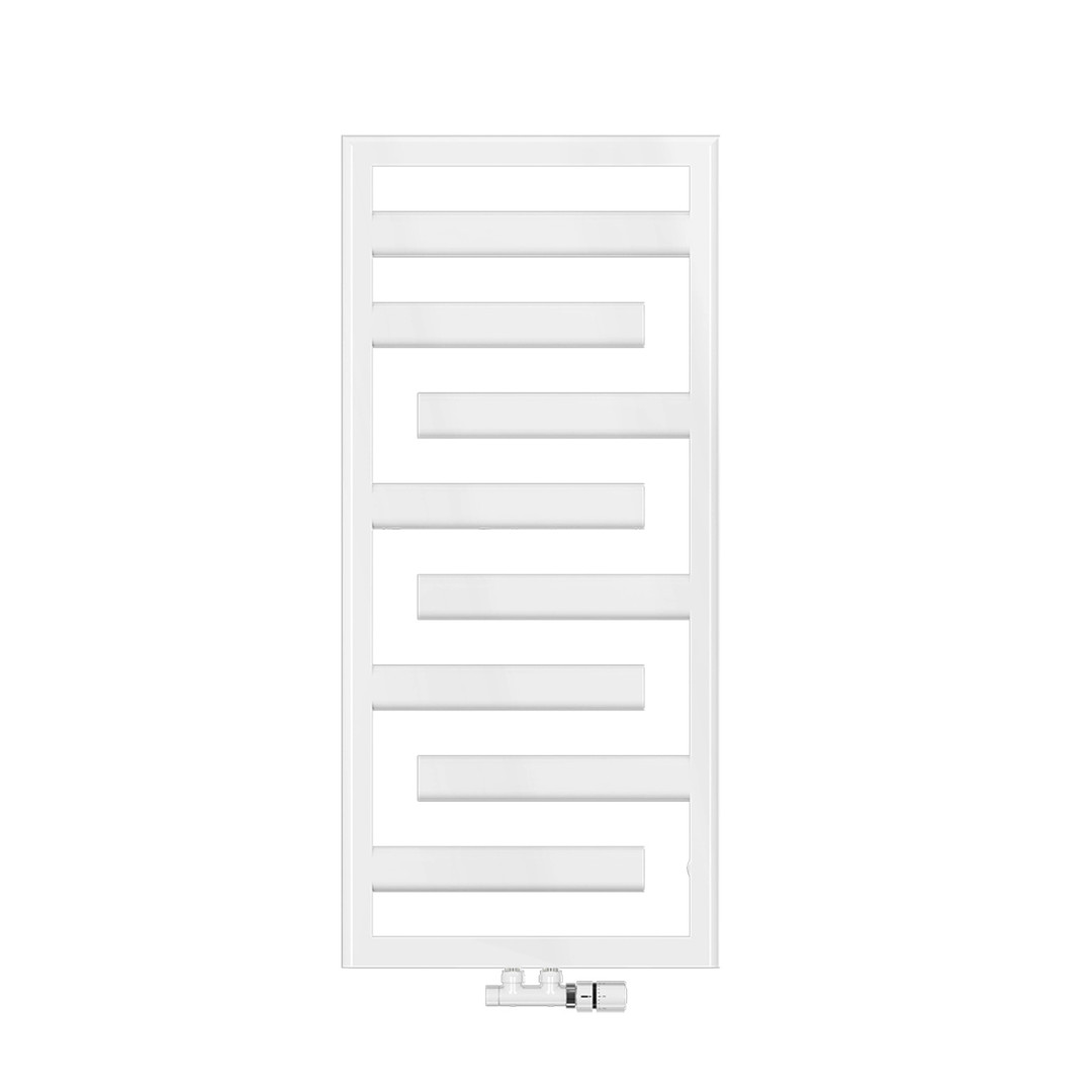 Anschluss an Warmwasser-Zentralheizung, lackiert, aus vertikal angeordneten nach außen abgerundeten D-Profilrohren 40 x 30 mm sowie versetzt angeordneten Flachovalrohren 60 x 30 mm, Aussparungen bieten Platz zum Aufhängen von mehreren Handtüchern und ermöglichen ein seitliches Einschieben, seitlich und oben angeordnete D-Profilrohre sowie ein Vierkantrohr 40 x 30 mm unten bilden einen funktionalen Rahmen, ein speziell entwickeltes hydraulisches Konzept des Heizkorpers und die innenliegenden Leitbleche optimieren den Wasserdurchfluss und erzielen die bestmögliche Heizleistung, Wärmeleistung nach EN 442, mit 2 Anschlüssen unten, 2x mittig 1/2" für Vorlauf/Rücklauf, Abstand 50 mm, mit Entlüftungsventil, Heizkörper mit Pulverlackierung, standardmäßig im Farbton RAL 9016, auf Wunsch in Sonderfarbe, Lieferung montagefertig mit Wandkonsolen, mit Verpackung, Betriebsberdruck max. 4 bar, Betriebstemperatur max. 110 °C