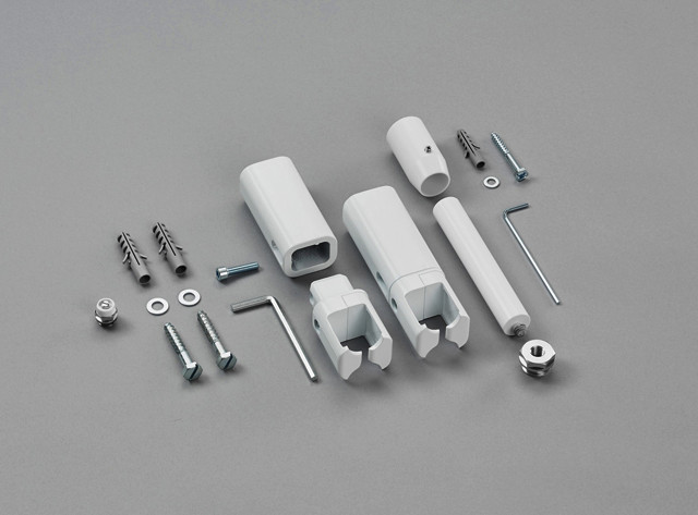 für Universal, 2x Wandkonsolen bestehend aus Wandhülse (88 mm), Schiebeteil, Klemmteil für 4-Kant-Profil, Entlüftungsventil 1/4", Bodenhülse (60 mm), Distanzstück M10 x 125, Befestigungsmaterial, Montageanleitung, für Wandabstand 103 mm