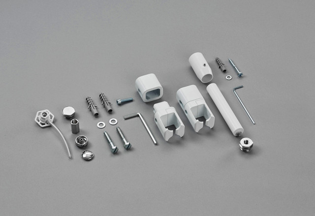 für Subway, Quaro (jeweils in Raumteiler-Ausführung), 2x Wandkonsolen bestehend aus Wandhülse (38 mm), Klemmteil, Design-Entlüftungsventil 1/2", 1 Bodenhülse (60 mm), 1 Distanzstück M10 x 125, 1 Blindstopfen 1/2" verchromt, Befestigungsmaterial, Montageanleitung, für Wandabstand 53 mm