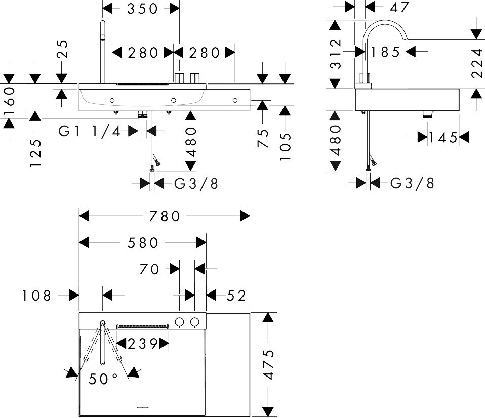 besteht aus Waschtisch, Waschtischarmatur, Waschtischarmatur besteht aus Auslauf, Rosette, Brause, Material: SolidSurface, Metall, Glanzgrad: matt, ohne Überlauf, Wandabstand Ablauf 332 mm, ComfortZone 220, Ausladung 185 mm, Auslaufhöhe 224 mm, mit Schwenkauslauf, Schwenkbereich 50°, Strahlart: Laminarstrahl, Rain, QuickClean+ Kalkablagerung vermeiden durch die Elastizität der Düsen, Thermostatkartusche zur Regelung der Temperatur, Ab-/Umstellventil, Mengensteuerung und Umsteller für 2 Verbraucher, max. Durchflussmenge bei 3 bar 5 l/min, mit Schallschutzmatte nach Maß, Anschlußart: G 3/8 Anschlussschläuche, passend für Xevolos und Xilesa Waschtischunterschränke, funktionsfähig ab 1 bar