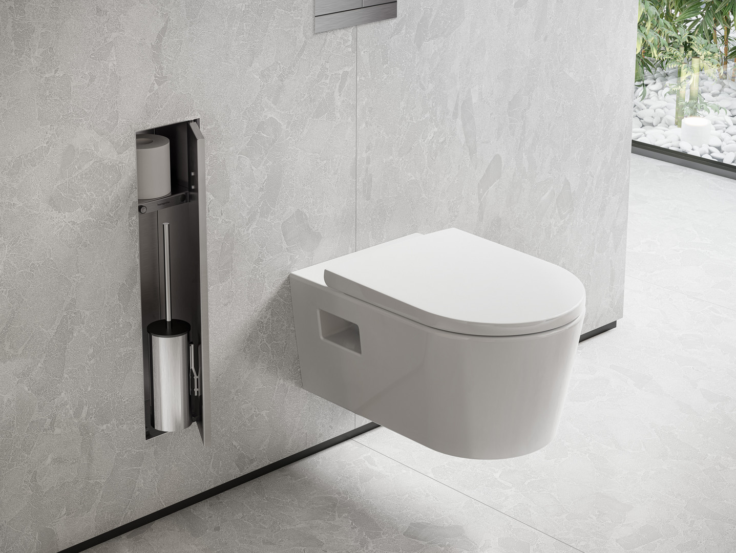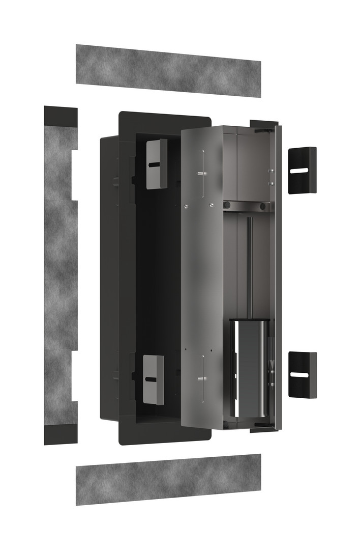 besteht aus: Wandnische mit befliesbarer Tür, Toilettenbürstenhalter, Toilettenburste, Ablage, Installationsset, Dichtungsset, befliesbare Push-Open Tür, Tiefe: 12 mm, Einbautiefe: 140 mm, Anwendungsbereich: Neubau, Sanierung, rahmenloses Design, Anpassung an Fliesenstärke möglich, Wandtyp: Trockenbau, Nassbau, Material Dichtungsset: Polystyrol (PS), Werkstoffgüte Wandnische: Edelstahl V2A (1.4301), Material des Bürstenhalters Kunststoff, verchromt, Maße Wandnische:595 x 145 x 140 mm (HxBxT), benötigte Maße für Installationssset 606 x 176 x 140 mm (HxBxT)
