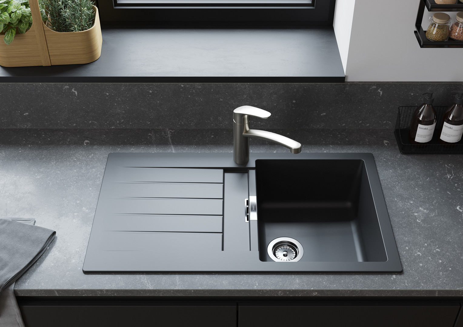 bestehend aus Einbauspüle, automatischer Ablaufgarnitur mit Siphon, Material SilicaTec, Hahnlöcher für Bohrung vordefiniert, Diamantbohrer enthalten, Ausrichtung reversibel, Einbauart Aufbau, Position Überlauf seitlich mittig im Becken, Beckentiefe 195 mm, Tiefe Zusatzbecken 120 mm, Unterschrank 450/600/600 mm