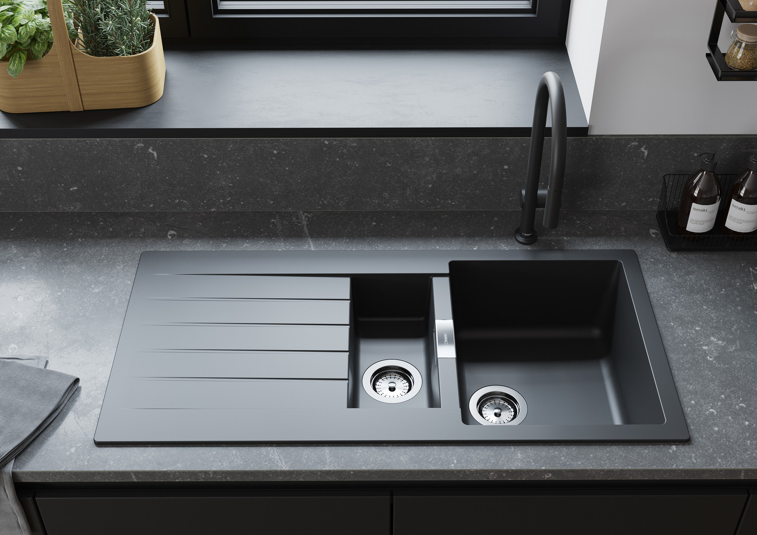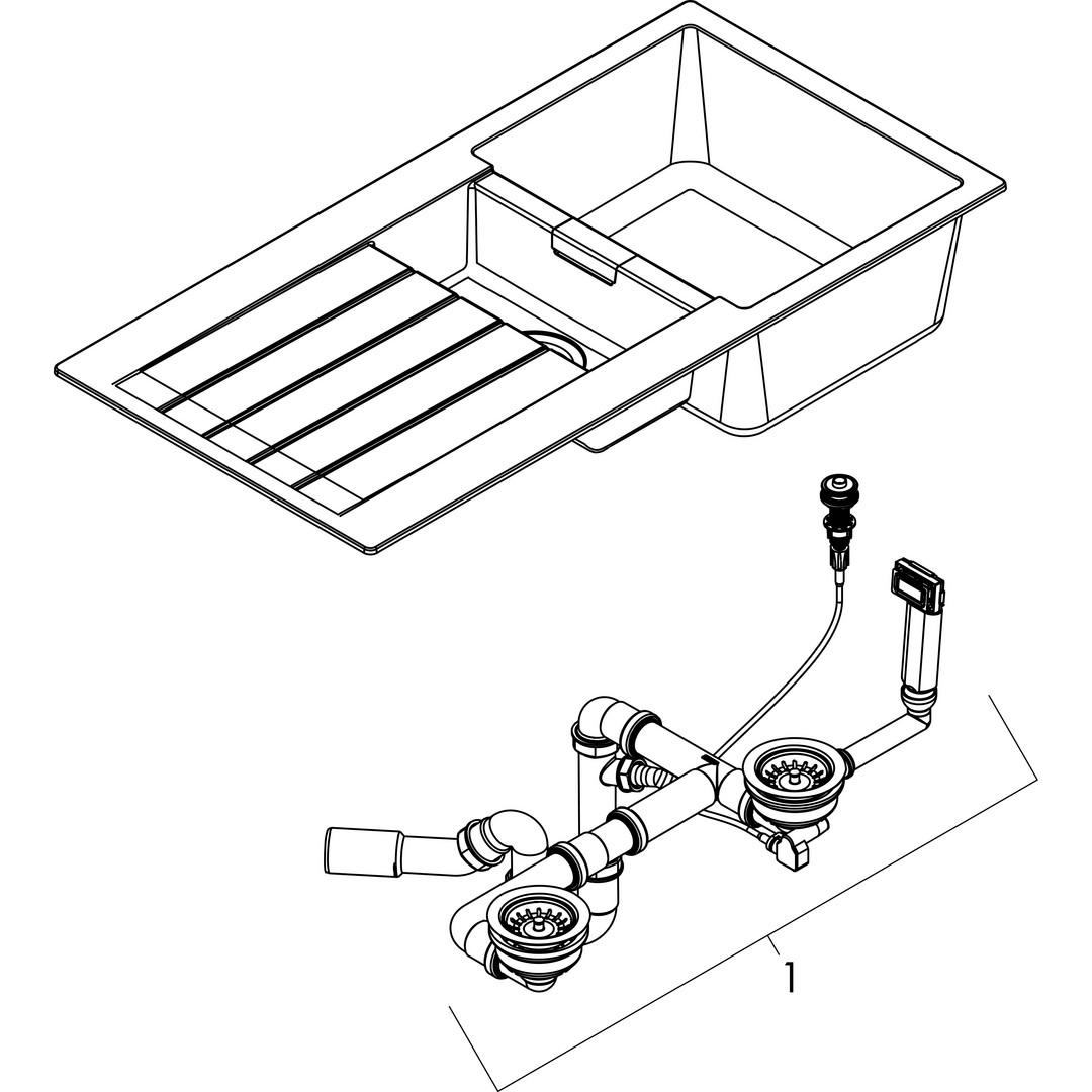 bestehend aus Einbauspüle, automatischer Ablaufgarnitur mit Siphon, Material SilicaTec, Hahnlöcher für Bohrung vordefiniert, Diamantbohrer enthalten, Ausrichtung reversibel, Einbauart Aufbau, Position Überlauf seitlich mittig im Becken, Beckentiefe 195 mm, Tiefe Zusatzbecken 120 mm, Unterschrank 450/600/600 mm