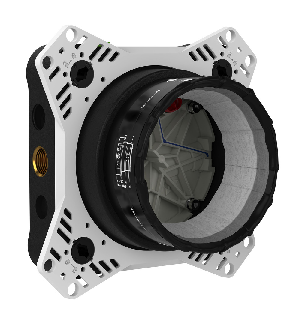 passend für alle neuen Brausen-, Wannen- und Thermostat-Fertigsets UP, Material entzinkungsarmes Messing und EPP Schaum, wärme- und schallisolierend, keine zusatzliche Serviceöffnung notwendig, rotationssymmetrische Montage, schallentkoppelte Montage, flexibler Montagering für unterschiedliche Montagesituationen, Montagering einstellbar in 5 mm Schritten, Montagering geeignet für die Installation auf der Vorder- und Rückseite, dank Schiebehülse kein Kürzen notwendig, Auflagehilfe für die Wasserwaage, integrierte Libelle für eine korrekte horizontale und vertikale Ausrichtung, Dichtmanschette dauerhaft befestigt, minimale Einbautiefe 80 mm, maximale Einbautiefe 108 mm