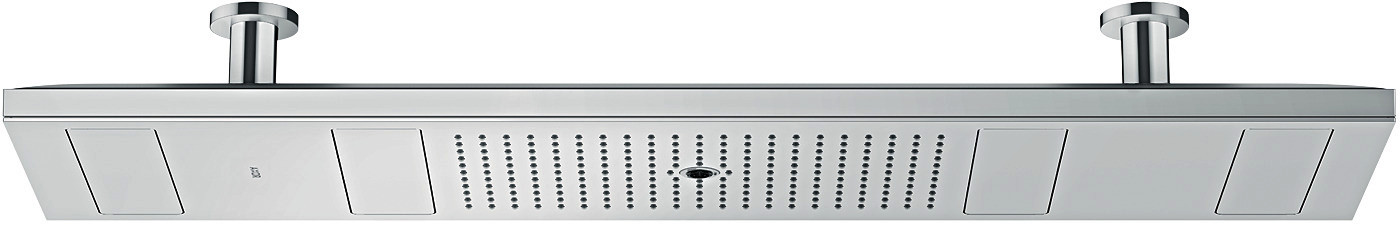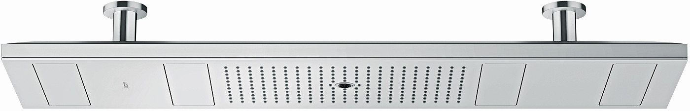 Brausekopfgröße 1200 x 300 mm, Strahlart: Rain, Mono, PowderRain, Select Umstellung an der Armatur, Material Strahlscheibe Metall, Metalldeckenanschluss, Deckenanschlusslänge 100 mm, max. Durchflussmenge bei 3 bar 30 l/min, Durchflussmenge Rain Strahl bei 3 bar 16 l/min, Durchflussmenge Mono Strahl bei 3 bar 15 l/min, Durchflussmenge PowderRain außen bei 3 bar 12 l/min, Durchflussmenge PowderRain innen bei 3 bar 12 l/min, Mindestfließdruck 3 bar, einzeln oder kombiniert ansteuerbar, Kopfbrause zur Reinigung abnehmbar, herausfahrbare Klappen können zur Reinigung manuell geöffnet werden, Deckenmontage, herausfahrbare Klappen sind voreinstellbar auf die Körpergröße, mit integrierter Beleuchtung, Lampe LED, Spannungsversorgung 24 V, Transformator Netzteil, 24 V, 60 W, Eingangsspannung w 100-240 V AC/50/60 Hz, Ausgangsspannung 24 V-DC, Lichtfarbe neutralweiß, nicht für Durchlauferhitzer geeignet, Quick Clean Antikalksystem, Grundkörper ist nicht enthalten