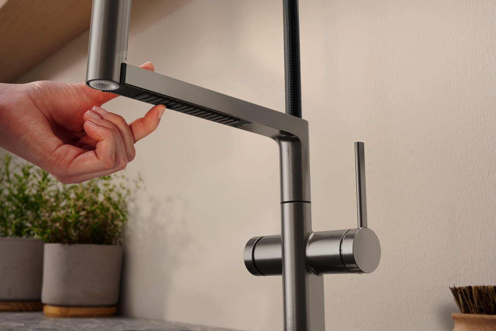ComfortZone 210, Schwenkbereich einstellbar in 4 Stufen auf 60°, 110°, 150° oder 360°, PowderSpray, Brausestrahl, Laminarstrahl, Schwenkarm unabhängig bewegbar von dem Schlauch, vorderer Brausestrahl arretierbar, Strahlumstellung durch Tastendruck und Strahlrückstellung automatisch durch Schließen der Armatur, Select-Knopf zur komfortablen Umstellung von PowderSpray auf die vordere Brause, MagFit magnetische Brausehalterung, maximale Durchflussmenge bei 3 bar 5,6 l/min, Keramikmischsystem, Temperaturbegrenzung einstellbar, Rückflussverhinderer integriert, für Durchlauferhitzer geeignet, Hahnlochbohrung mit 35 mm erforderlich, Movaflex Schlauch ist flexibel schwenkbar (360°), Textilschlauch mit Umflechtung, die Garne sind aus recyceltem PET hergestellt, warmes, baumwollähnliches Material