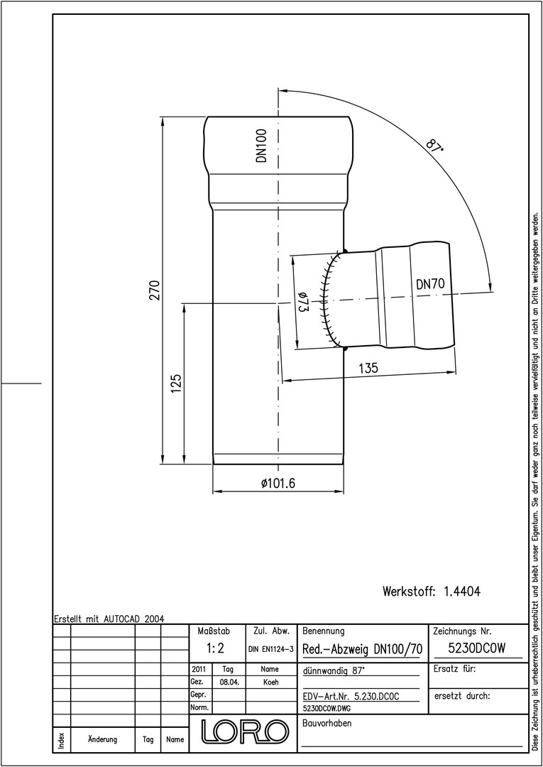 LORO XCL Reduzier-Abzweig DN 100/70, 87°, Werkstoff 1.4404