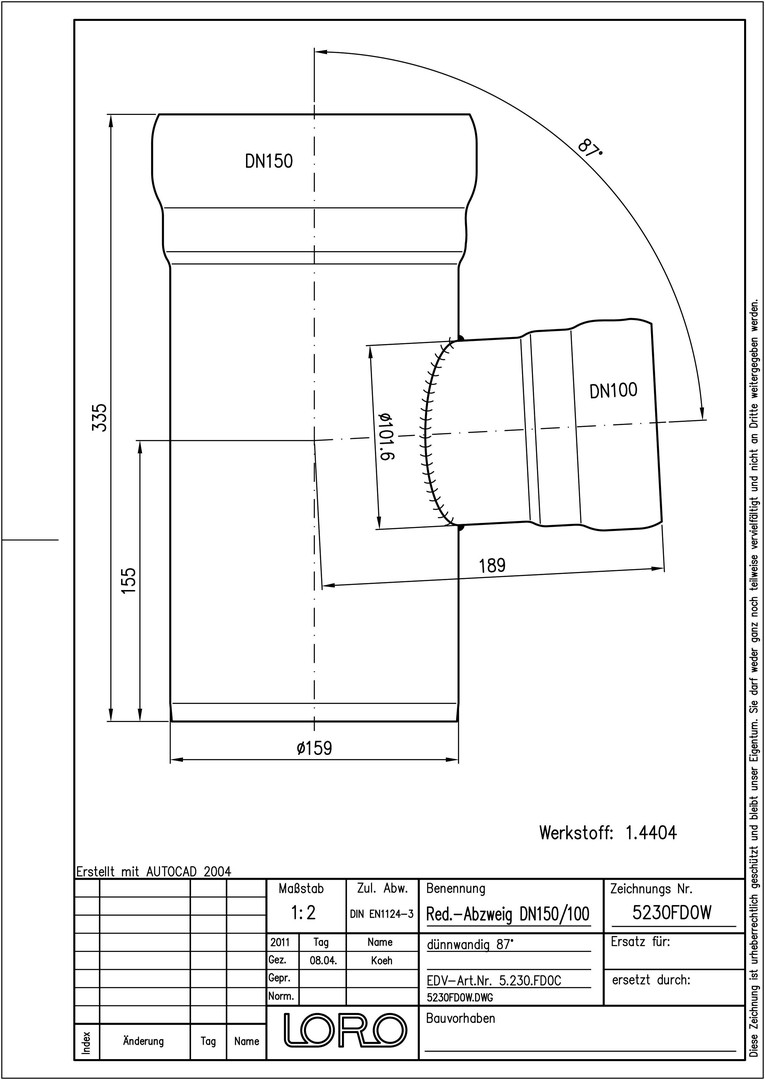 LORO XCL Reduzier-Abzweig DN 150/100, 87°, Werkstoff 1.4404