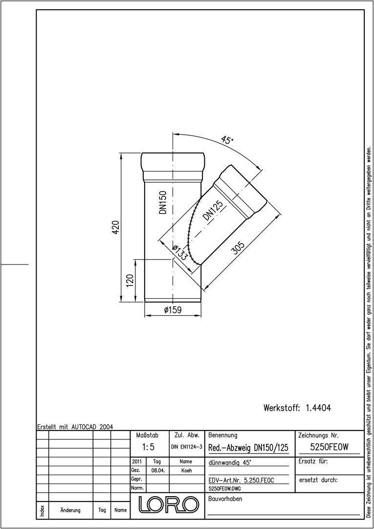 LORO XCL Reduzier-Abzweig DN 150/125, 45°, Werkstoff 1.4404