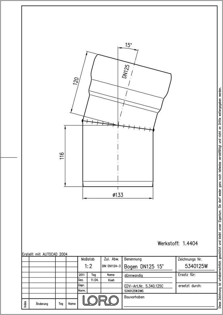 LORO XCL Bogen DN 125, 15°, Werkstoff 1.4404