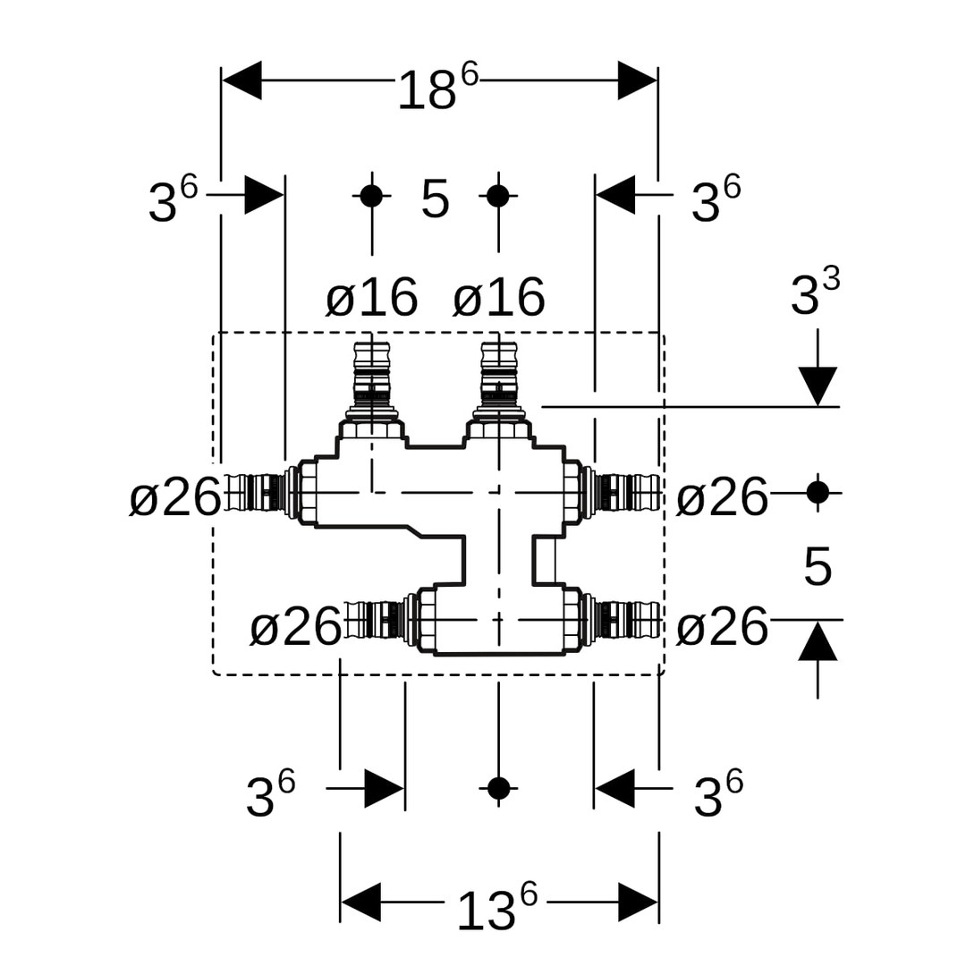 Geberit Kreuzungs-T-Stück Mepla Ø 26 x 16 x 26 mm, mit Dämmbox