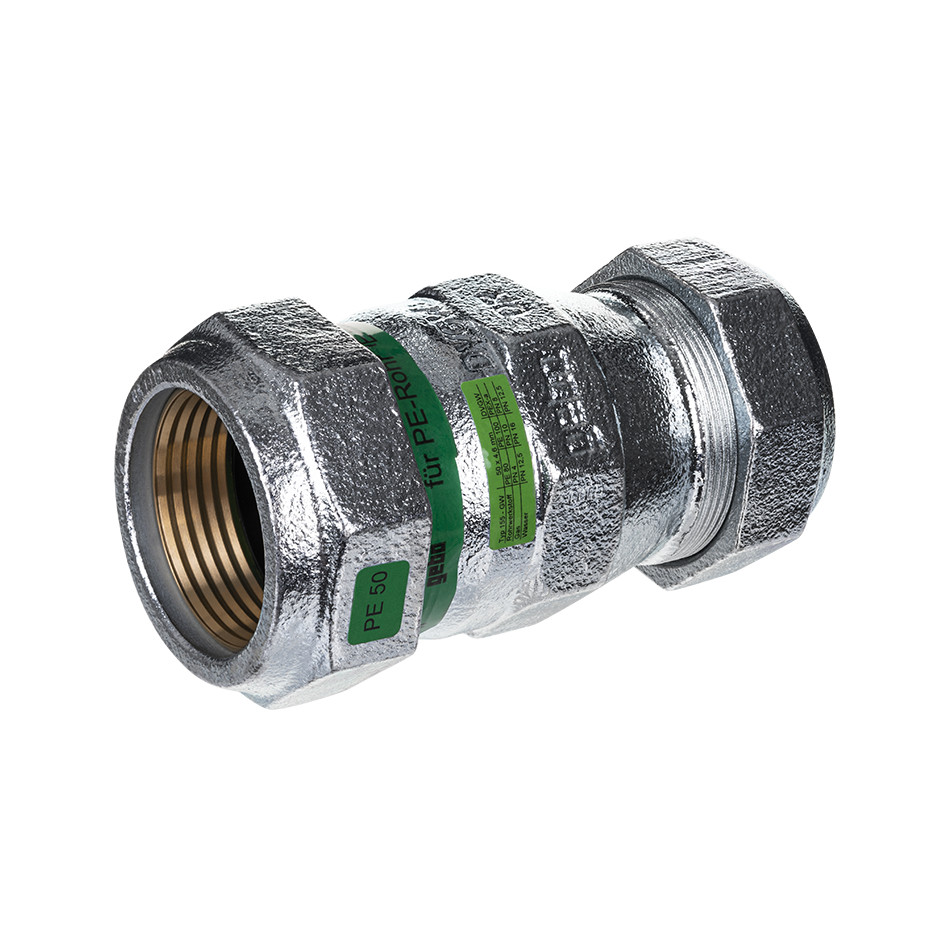 Temperguss-Klemmverbinder, beidseitig zum Klemmen, reduziert, für PE-Rohr PE 80, PE 100, PE-Xa-Rohr (jeweils SDR 11) nach DVGW – Arbeitsblatt GW 335 A2/A3 sowie DIN 8074/75, DIN EN 12201-2 und DIN 16893, 32-63 mm, Medien sind Wasser, Gas (außerhalb von Gebäuden) und Druckluft, Druckstufen bei Wasser (20 °C) PE80 und PE-Xa PN 12,5, PE100 PN 16, Gas PE100 PN 10, PE80 PN 4, PE-Xa PN 8, Druckluft PE80 und PE-Xa PN 10, PE100 PN 12,5, Prüfungen Wasser DIN 8076/GW 335-B4, DVGW-Reg.-Nr. DW-7511CP0561, Gas DVGW, Arbeitsblatt G 5600-1, DVGW-Reg.-Nr.: DG-7521CP0412, der Einsatz von Stützhülsen ist notwendig