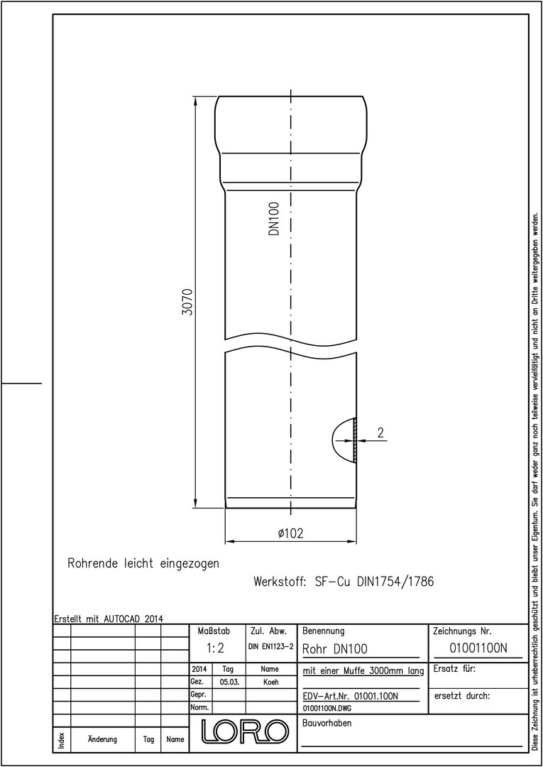 LORO N Regenfallrohr DN 100, 3000 mm, 1 Muffe, rund, Kupfer