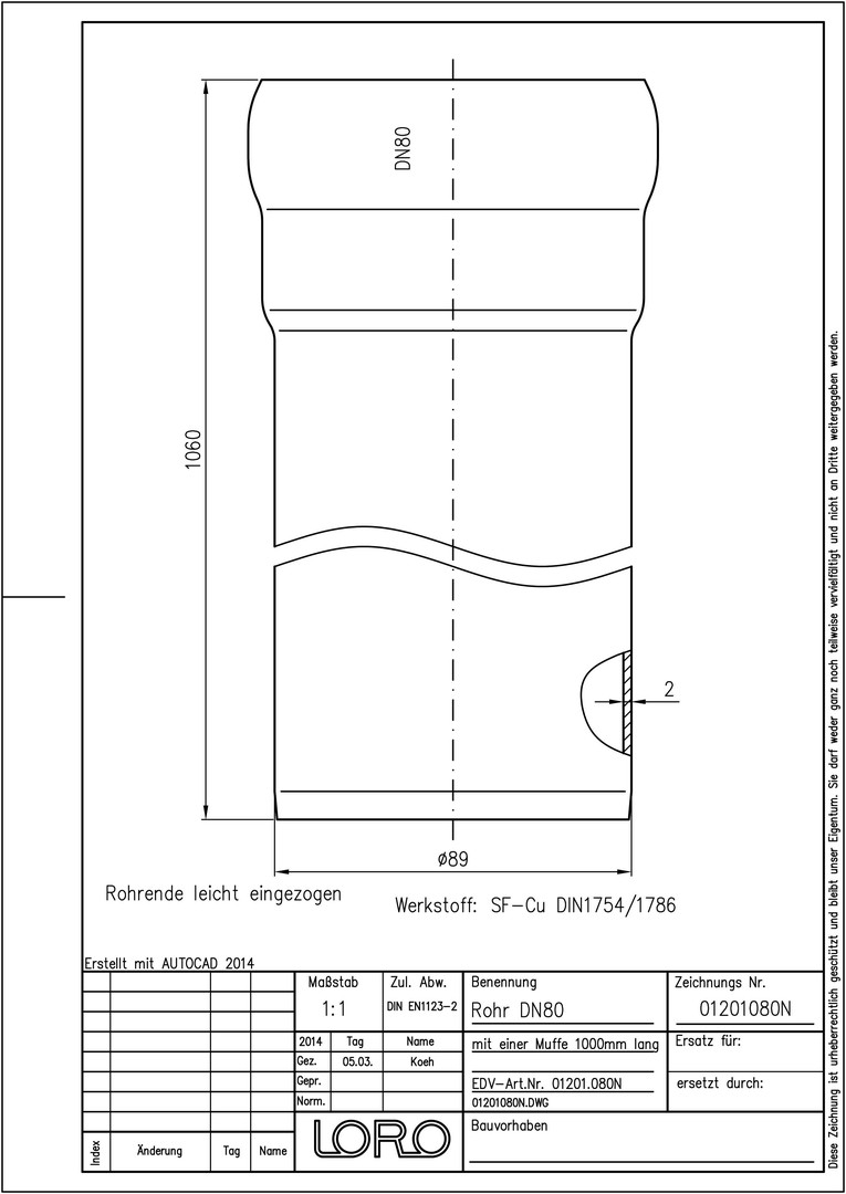 LORO N Regenfallrohr DN 80, 1000 mm, 1 Muffe, rund, Kupfer