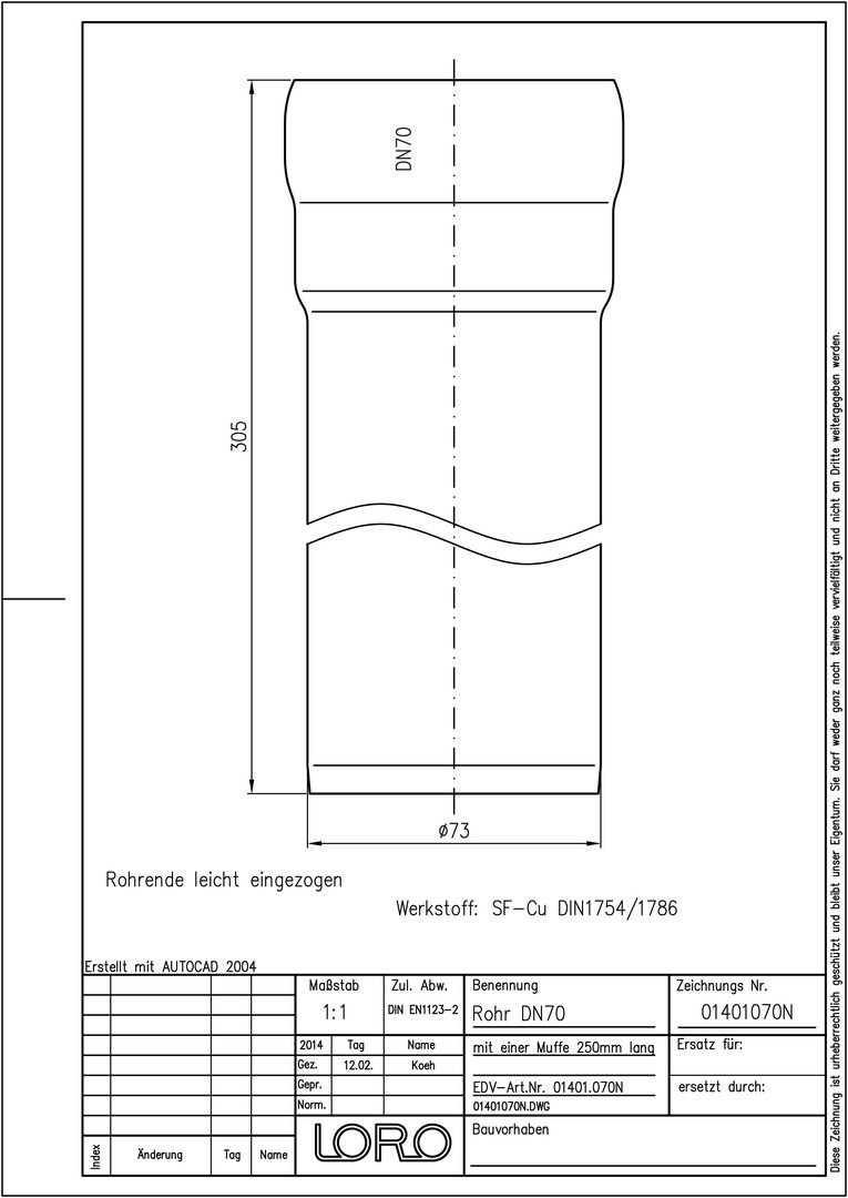 LORO N Regenfallrohr DN 70, 250 mm, 1 Muffe, rund, Kupfer