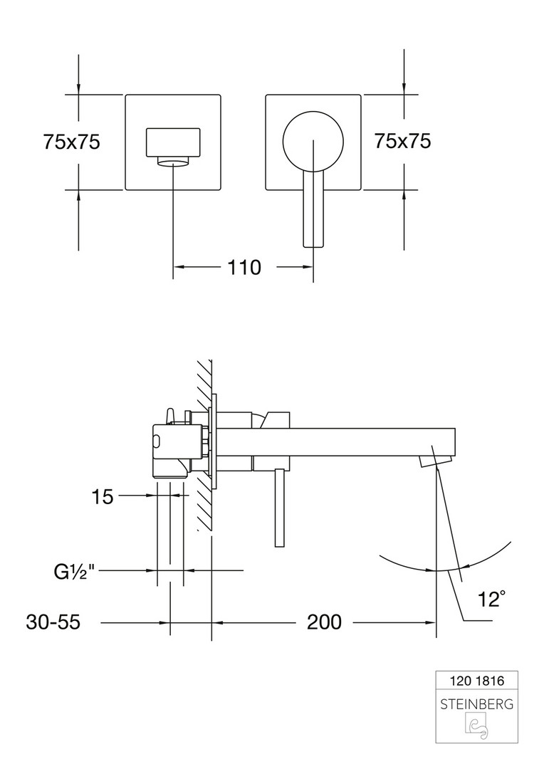 Steinberg Waschtisch-Wand-Einhebelmischer Serie 120 Ausladung 200 mm, chrom, 2-Loch-Montage, mit Einbaukörper 1/2"