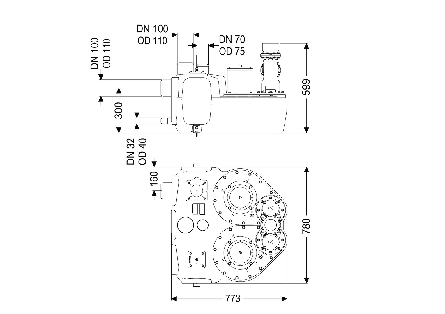 mit Comfort-Schaltgerät, Anlage mit zwei Pumpen, zur freien Aufstellung, Sammelbehälter aus PE, mit Freistromrad, Pumpen Typ SPF, Behältervolumen 120 l, max. Nutzvolumen 50 l, schalldämmender Unterlegmatte, 230 V-Versionen steckerfertig, elastische Schlauchverbindung DN 100, Druckabgang senkrecht DN 100/OD 110 ohne Absperreinrichtung, waagerecht DN 100/OD 110 mit Absperreinrichtung, Kabellänge 5 m